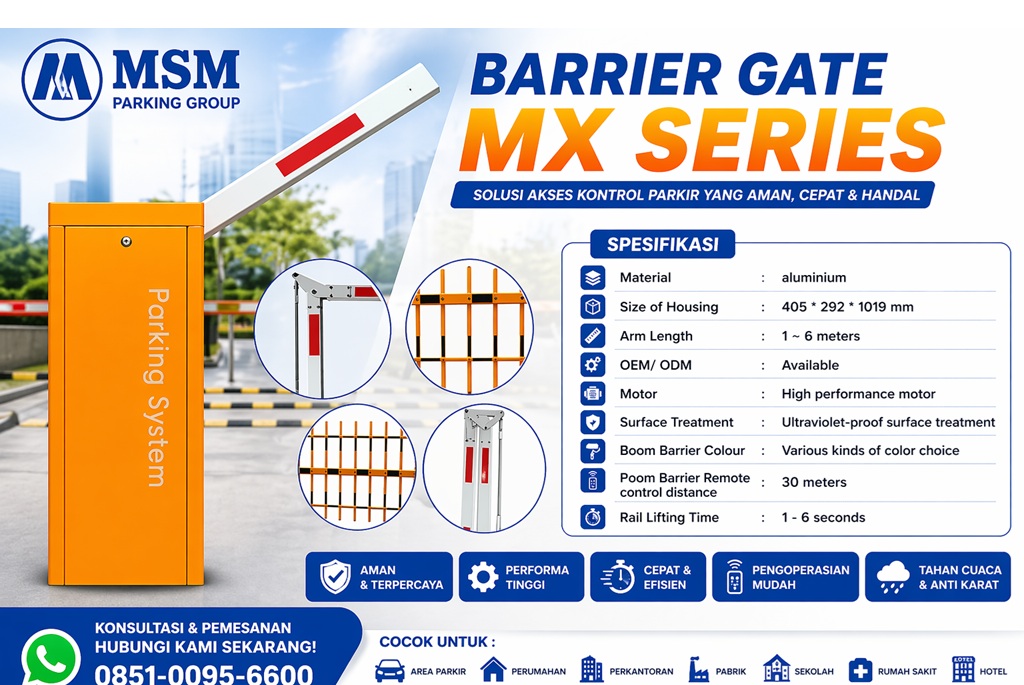 Dalam mengelola area parkir dengan trafik kendaraan yang padat, kecepatan dan daya tahan alat adalah kunci utama. MSM Parking menghadirkan Barrier Gate MX Series, palang parkir kelas dunia yang dirancang khusus untuk penggunaan intensif seperti di mal, bandara, area perkantoran, hingga kawasan industri.